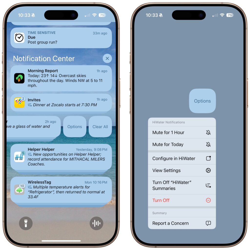 Finally, Apple made it easier to manage settings for notification summaries from the Lock Screen. On an iPhone, for instance, you can swipe right to reveal an Options button, tap it, and then tap Turn Off AppName Summaries. You can also report a concern with a summary—Apple solicits feedback as part of the Apple Intelligence beta.