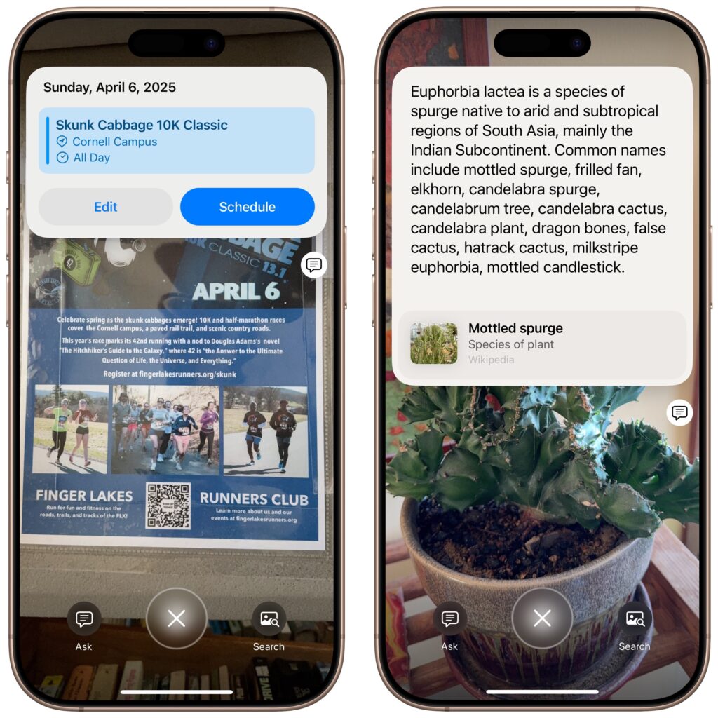 Apple Intelligence enhances the new Camera Control button on iPhone 16 models, enabling it to respond based on what’s in the viewfinder. Initially, it could only ask ChatGPT about what it saw or conduct a Google image search. Now, when you press and hold the Camera Control, Visual Intelligence can also detect whether you’re pointing at a poster or flyer and suggest creating a calendar event. Additionally, if it identifies a plant or animal within the frame, it will recognize it and provide more information with a tap.