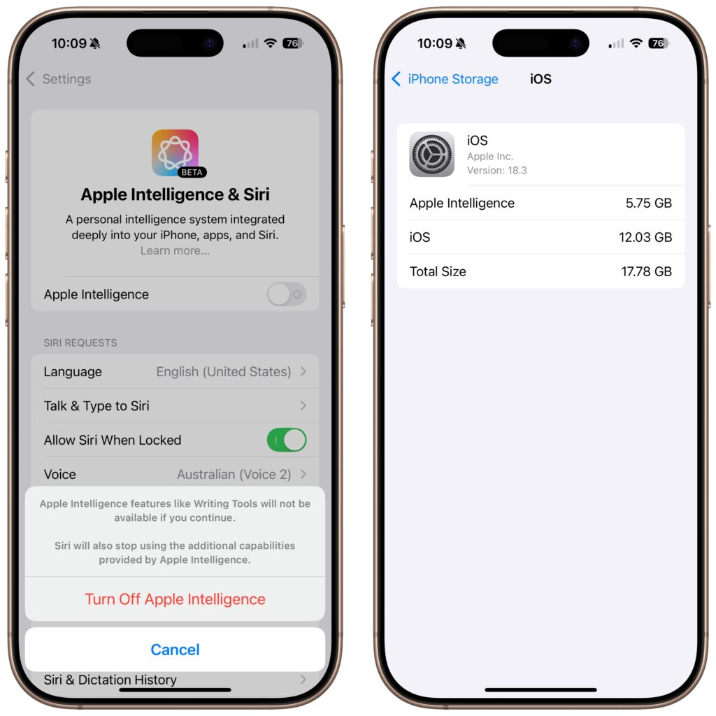 Apple Intelligence requires up to 7 GB of storage space (we see it occupying 5 GB in macOS 15.3 and 5.75 GB in iOS 18.3), so if your Mac, iPhone, or iPad is low on space, you may want to turn it off to free up room for photos, movies, and apps. Do that in the Apple Intelligence & Siri section of System Settings or Settings. However, you might not notice recovered space until your device decides to reclaim it. To check your space usage on a Mac, navigate to System Settings > General > Storage > macOS, and on an iPhone or iPad, go to Settings > General > iPhone/iPad Storage > iOS/iPadOS.
