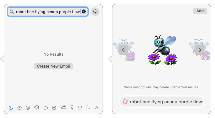 To create one, open the emoji picker, type a few words of description, and click Create New Emoji. You can then experiment with different descriptions and scroll through Apple Intelligence’s variants before clicking Add to save your Genmoji and insert it wherever you’re typing.