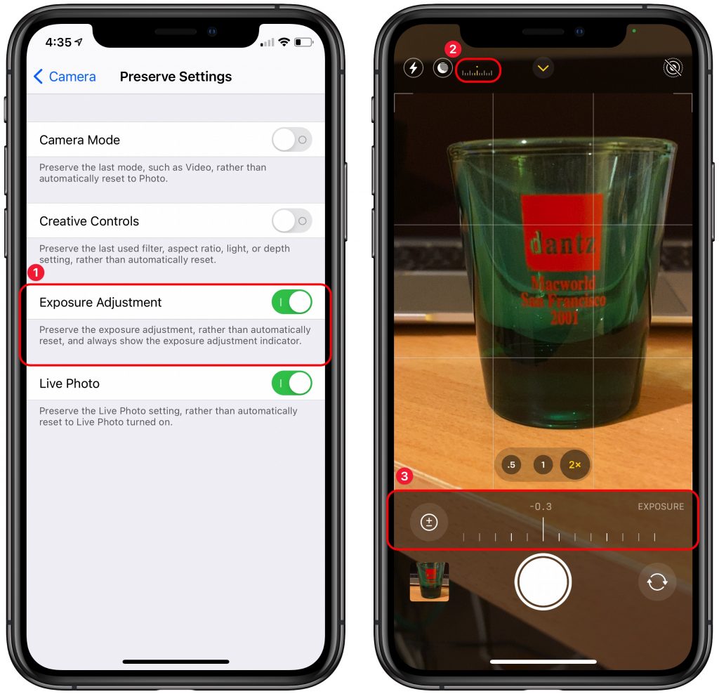 Sometimes, when you’re taking photos in challenging lighting conditions, you want to override the automatic exposure settings and keep those settings across multiple shots. In Settings > Camera > Preserve Settings, you can now enable Exposure Adjustment ➊, which maintains your settings across shots and shows the exposure adjustment indicator ➋ near the upper left at all times. Tap that indicator to display the exposure adjustment slider ➌ below.