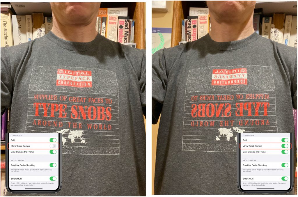 By default, when you’re taking a selfie with the iPhone’s front-facing camera, the preview shows you what you’d see in a mirror, but the eventual photo instead displays what someone looking at you would see. This is most noticeable when there’s text in the shot. Some people want the photo to look exactly like the mirrored version without having to edit the photo and flip it. iOS 14 now makes that possible with a Mirror Front Camera switch in Settings > Camera. It affects only the photo you take, not the preview, so you won’t see any change while composing the shot. In the examples below, the left-hand image shows the Camera app’s default behavior, and the right-hand image shows what you get if you enable Mirror Front Camera.