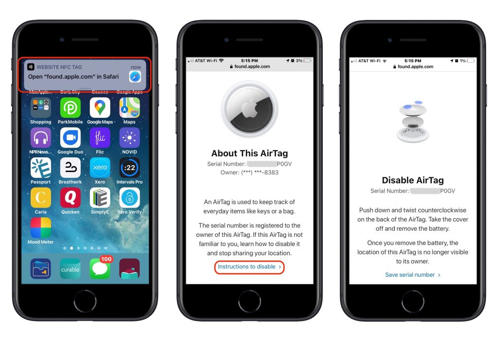 - NFC identification: Let’s say you find an AirTag after a safety alert or sound. Hold an iPhone or other NFC-capable smartphone to the white side of the AirTag and tap the notification to load a website with the AirTag’s serial number and the last four digits of the owner’s phone number (which may help you or the police identify them). If the owner has marked it as lost, you’ll also see their phone number or email address.
