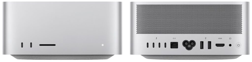 To hold the M1 Ultra—or a less expensive M1 Max—Apple introduced an entirely new Mac that looks like an inflated Mac mini. The Mac Studio has the same 7.7-inch (19.7 cm) square outline, but is more than twice as tall, clocking in at 3.7 inches (9.5 cm) high. Much of that vertical space is occupied by cooling fans, but Apple says the Mac Studio makes minimal noise.