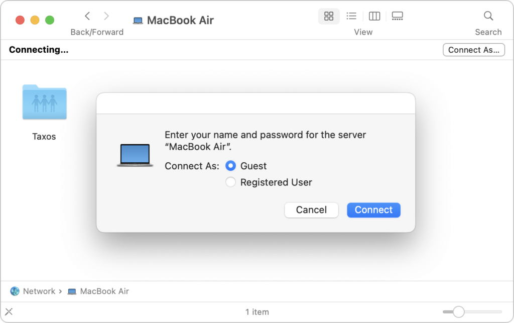 - In the Network window, double-click the Mac with the shared drive or volume, click Connect As, select Guest in the Connect As window, and then click Connect. The shared drive or volume becomes available like any other external hard drive.