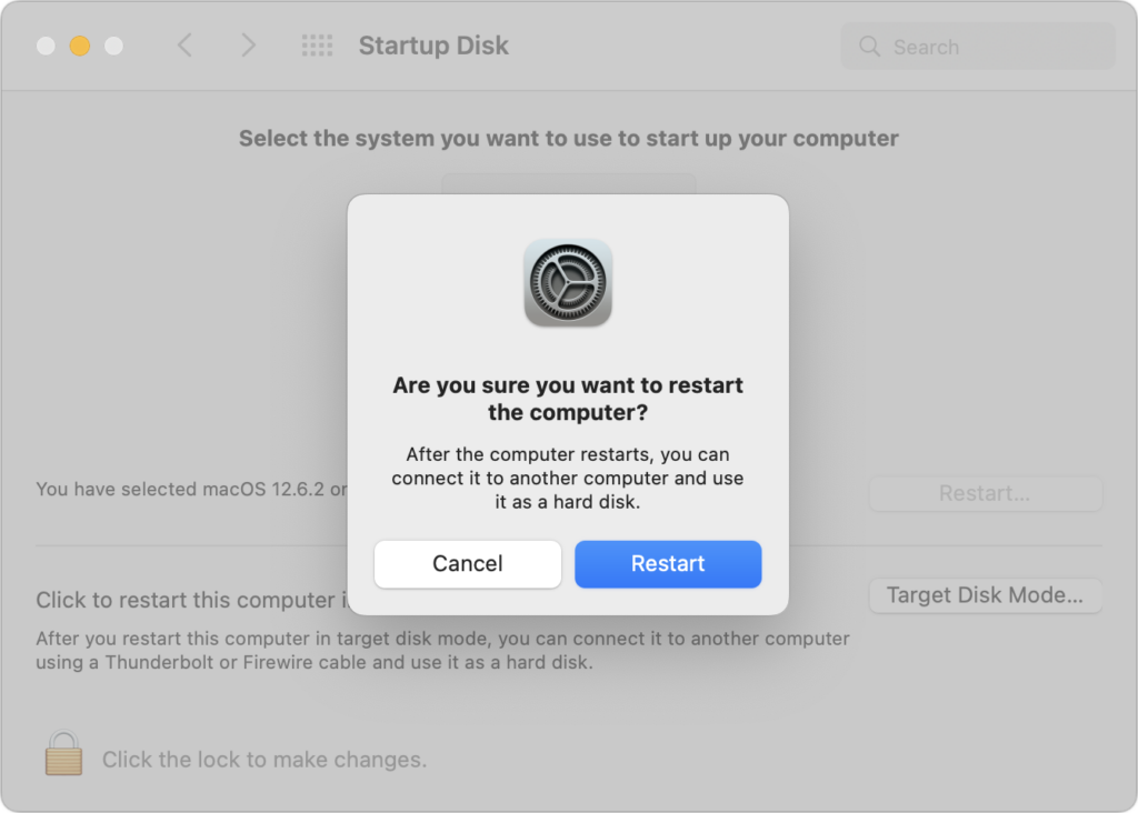 - Open System Settings/Preferences > Startup Disk, click Target Disk Mode, and then click Restart.
