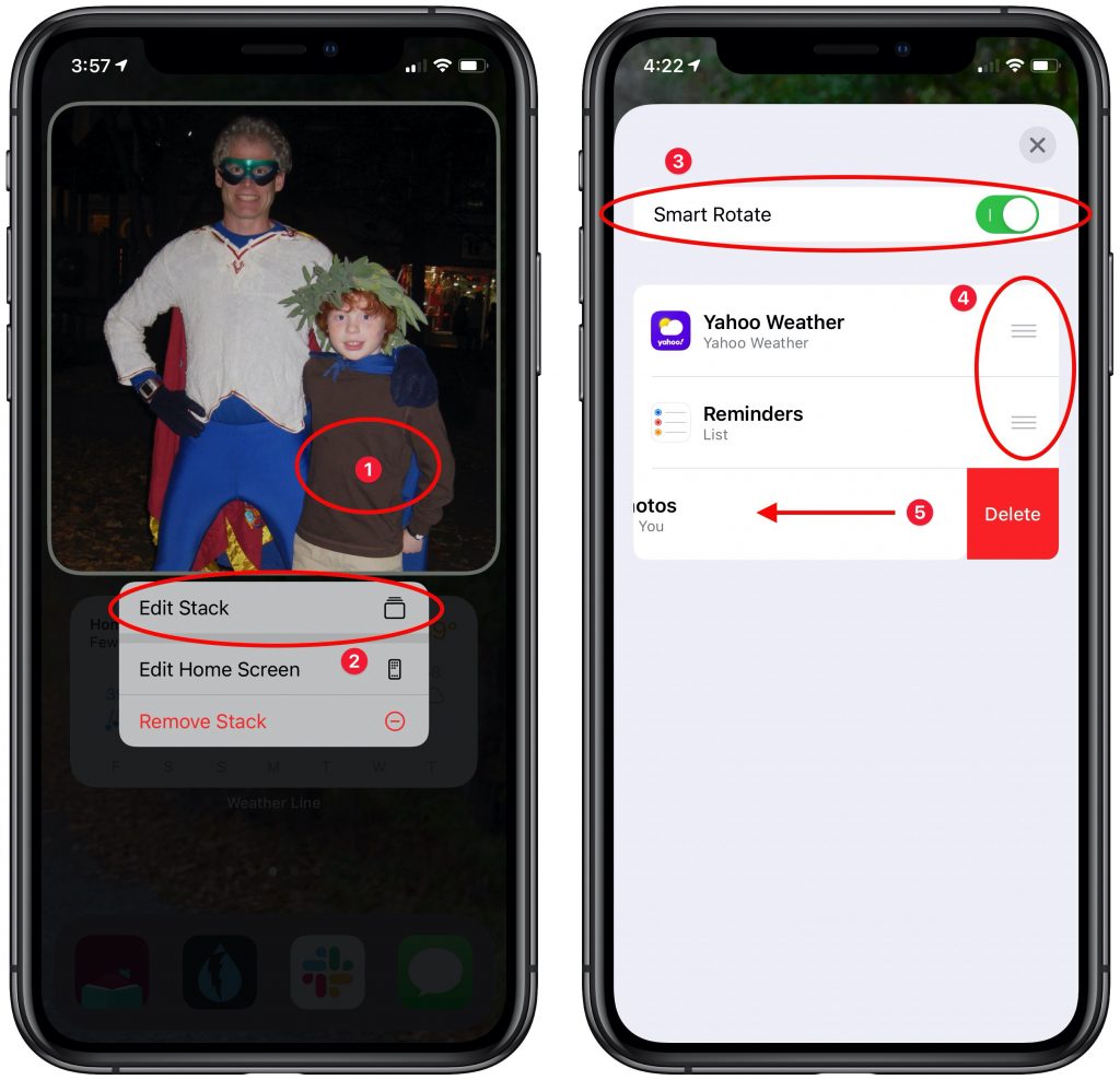 Stacks have another trick up their sleeve: Smart Rotate. When this option is enabled, the stack automatically displays the widget it thinks you’re most likely to want to see from the available set. How it chooses is a black box, so we can’t predict how well it will work for you. Smart Rotate seems to be on by default; if you want to check or turn it off, touch and hold on a stack ➊, tap Edit Stack ➋, and then toggle the Smart Rotate switch ➌. Note that you can also rearrange the order of widgets by dragging their handles ➍ and delete one directly by swiping left on it ➎.