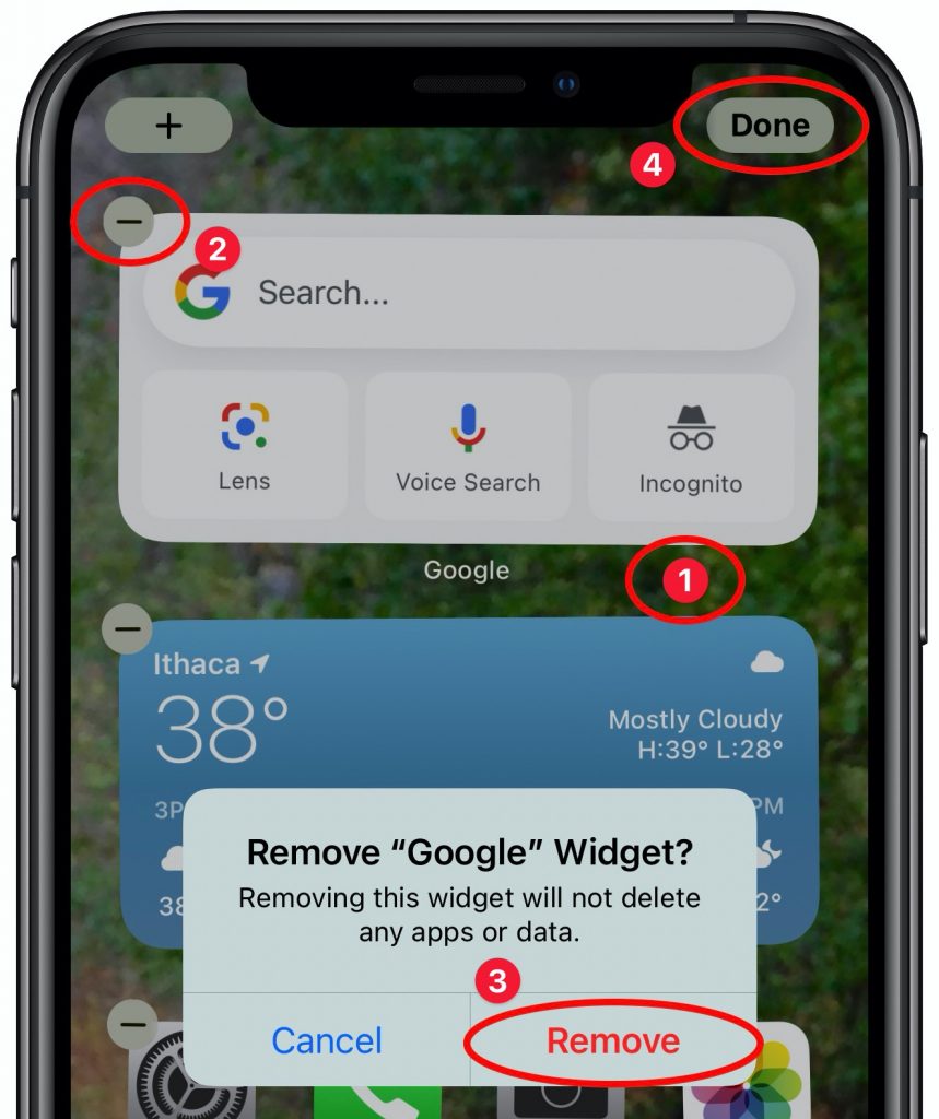 - Tap the – button in the upper-left corner of a widget or stack.