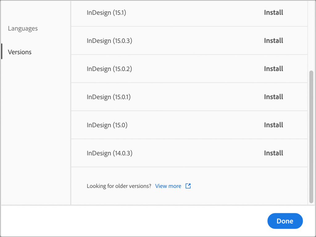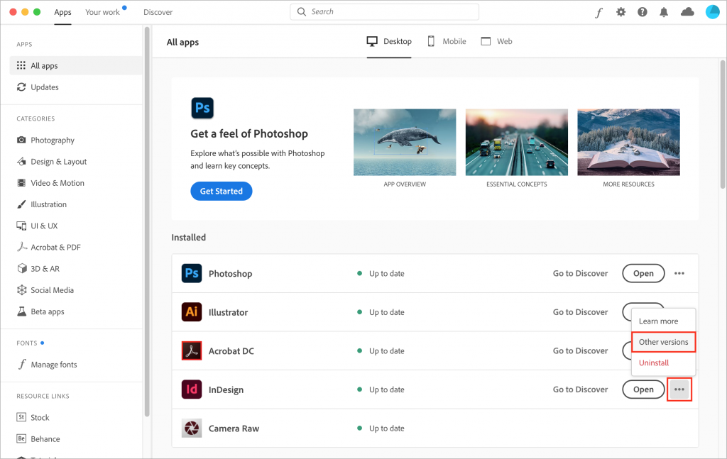Open the Creative Cloud app, click the ••• button to the right of the desired app, and choose Other Versions from the pop-up menu.