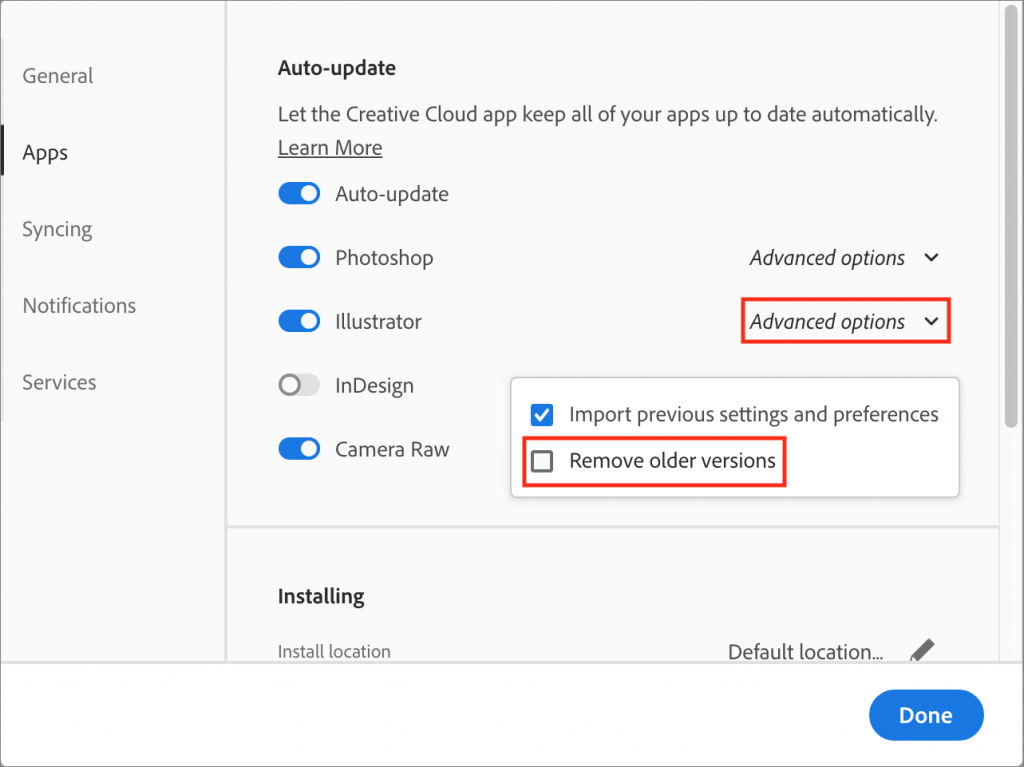 You can ensure that you don’t lose access to older versions during updates by disabling a Creative Cloud setting that automatically removes previous versions of apps when you update. In the Creative Cloud app, choose Creative Cloud > Preferences > Apps. Then click Advanced Options to the right of the desired app’s name, and in the dialog that appears, deselect Remove Older Versions. When you’re finished, click Done.