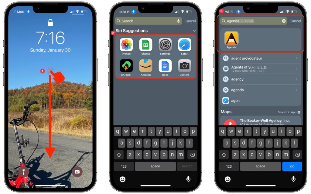 Most of the time, when you unlock your iPhone or iPad, you want to launch an app. In iOS 15 and iPadOS 15, you no longer have to unlock the device, find the app on a Home screen page, and tap it. Instead, you can open an app directly from the Lock screen, assuming Settings > Face/Touch ID & Passcode > Today View and Search is turned on. Just swipe down from the middle of the Lock screen ➊ to access the Search screen, which lists apps from Siri Suggestions ➋. You can tap one of those to open it, or you can use the Search field to find an app by name and tap the search result ➌.