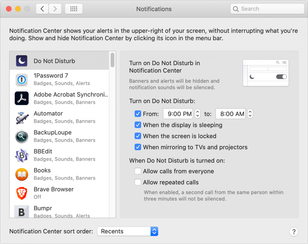 We’re all accustomed to the Do Not Disturb feature on our iPhones since they’re with us for most of the day and often spend the night next to the bed. But Apple long ago added Do Not Disturb to the Mac as well, and it’s useful for muting your Mac at night to eliminate unnecessary noises and for preventing unwanted notifications during presentations. In System Preferences > Notifications > Do Not Disturb, you can tell macOS to turn the feature on during specific times, when the display is sleeping or locked, and when mirroring to another screen. Or, you can turn on Do Not Disturb manually—you might want to do this when giving a presentation with Zoom or another videoconferencing app. In macOS 10.15 Catalina and earlier, do this in Notification Center by clicking it at the far right of the menu bar, scrolling up, and enabling the Do Not Disturb switch. In macOS 11 Big Sur, you find Do Not Disturb in Control Center.