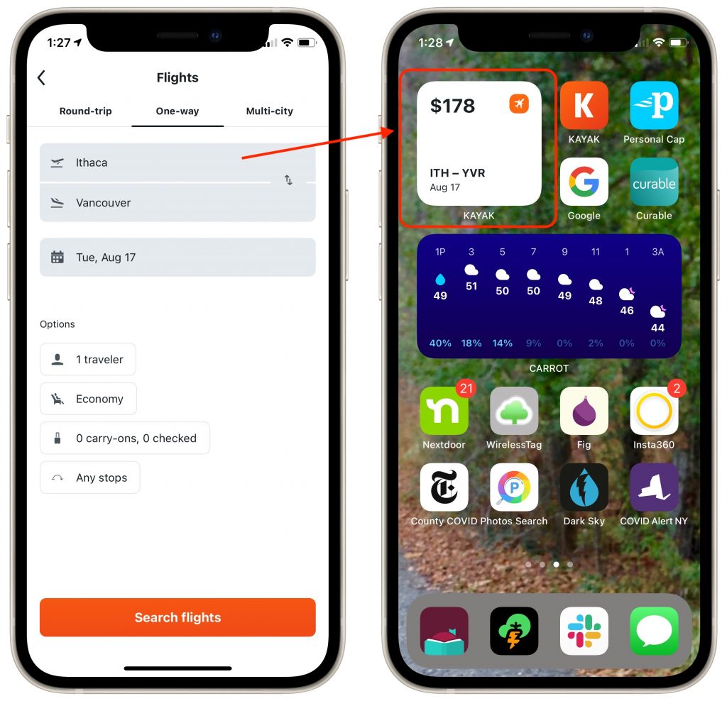 Home screen widgets are one of the coolest features of iOS 14. They enable apps to offer quick access to features or at-a-glance previews of changing information, such as the Weather app’s widget providing a quick look at upcoming weather. What you may not realize, however, is that an app’s widgets become available for adding to your Home screen only if you have launched the app since upgrading to iOS 14. (To see the list, press and hold on an empty part of the Home screen and then tap the + button in a top corner.) For instance, if you haven’t traveled since the pandemic started, you might not realize that the Kayak app has a handy price alert widget. Just launch the app once, and you’ll see its widgets the next time you look through the complete widget list.