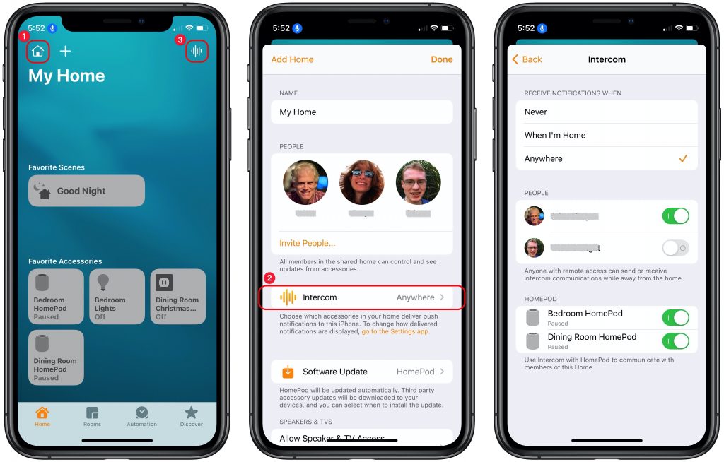 You can also access Intercom from within the Home app. Tap the waveform button in the upper-right corner of the screen (➌ above), record your message, and tap the Done button to send it.