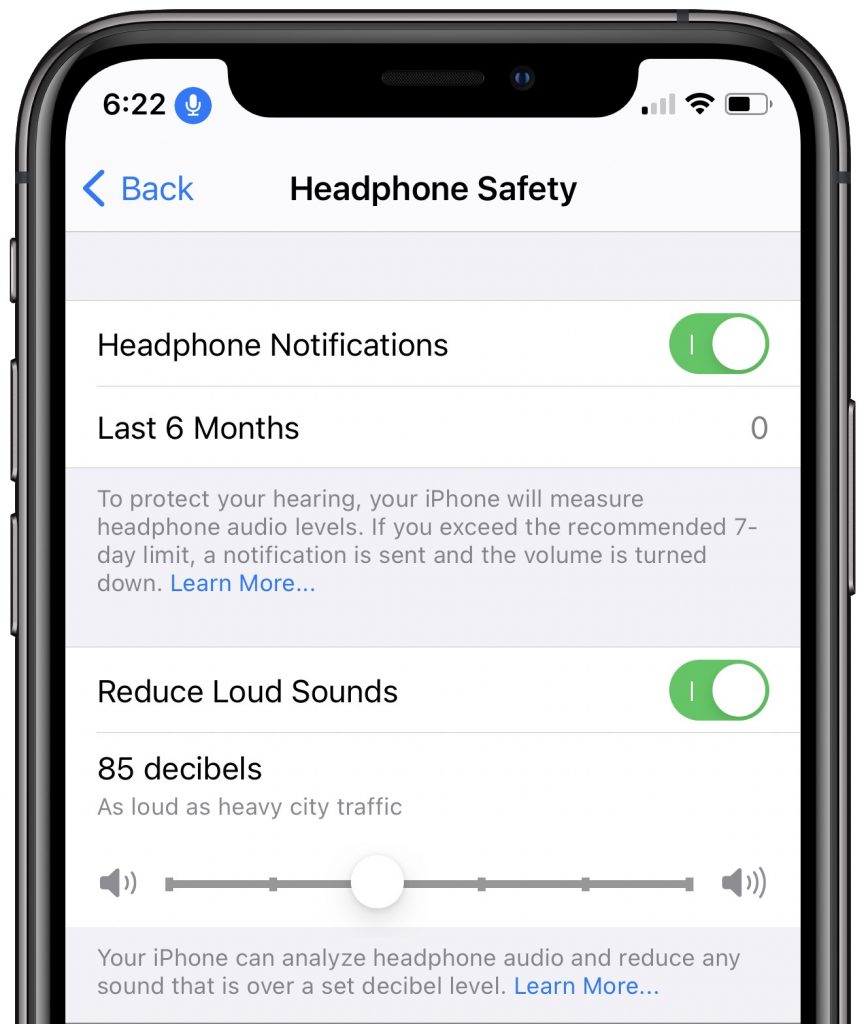 If you’re worried about damaging your hearing with too-loud headphone volumes (and you should be), go to Settings > Sounds & Haptics > Headphone Safety. There you can enable a notification that will tell you if you exceed the recommended limit for noise exposure (volume and time) as set by the World Health Organization.