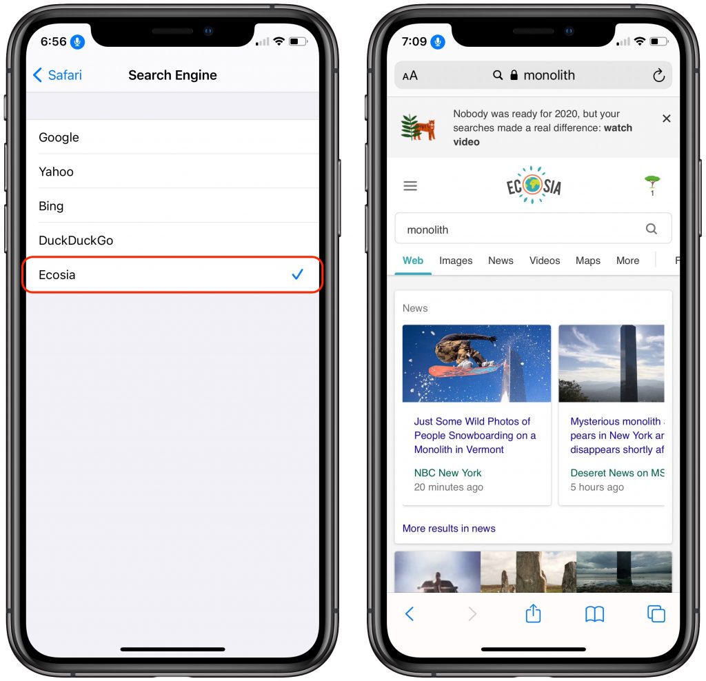 Want to move away from Google as your default search engine? iOS has long provided other options, including Yahoo, Microsoft’s Bing, and the privacy-focused DuckDuckGo. Apple has now added Ecosia, which is privacy-friendly and donates 80% or more of its profits to non-profit organizations that focus on reforestation. It’s a small way you can help fight climate change. It’s worth keeping in mind that Yahoo is a rebadged version of Bing, DuckDuckGo relies heavily on Bing, and Ecosia delivers results from Bing, enhanced by its own algorithms. In other words, when it comes to the quality of the search results, your choices are really between Google and Bing.