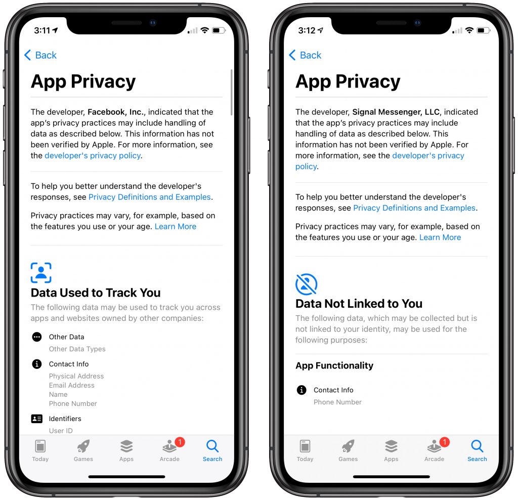 In Apple’s latest salvo against privacy-abusing apps and services, the company now requires all developers to provide information in App Store listings about what data collected by the app is linked to you personally and what data will be used to track your online movements. Apple doesn’t verify the information, and there’s no way to know if the developer is being truthful. Nonetheless, it’s good to see Apple pushing developers to be more transparent about their privacy practices. In the screenshot below, compare the ten screens of App Privacy details for what Facebook hoovers up with what is collected by the privacy-focused messaging app Signal: just your phone number, which is necessary for others to contact you.