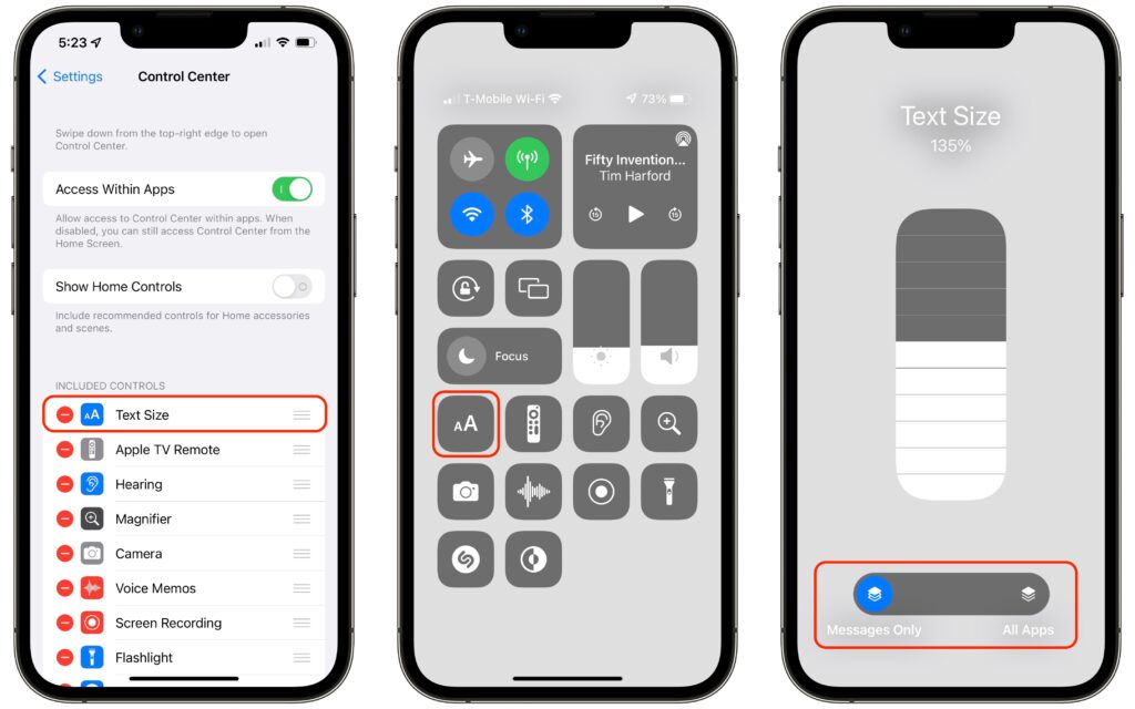 In previous versions of iOS, you could change the systemwide text size to make all apps—at least those that support Dynamic Type—display text at larger or smaller sizes. (Most people who use this feature want the text larger so it’s easier to read with aging eyes.) In iOS 15 and iPadOS 15, however, Apple lets you adjust the text size on a per-app basis, so you can increase it only for those apps where it really makes a difference for you. First, make sure Text Size is showing in Control Center by going to Settings > Control Center, and if it’s not in Included Controls, tap the green + button for it under More Controls. Then, while in an app where you want bigger text, invoke Control Center, tap the Text Size button, move the vertical slider to the desired setting, and then tap the App Only button so the setting affects only that app, not all apps.
