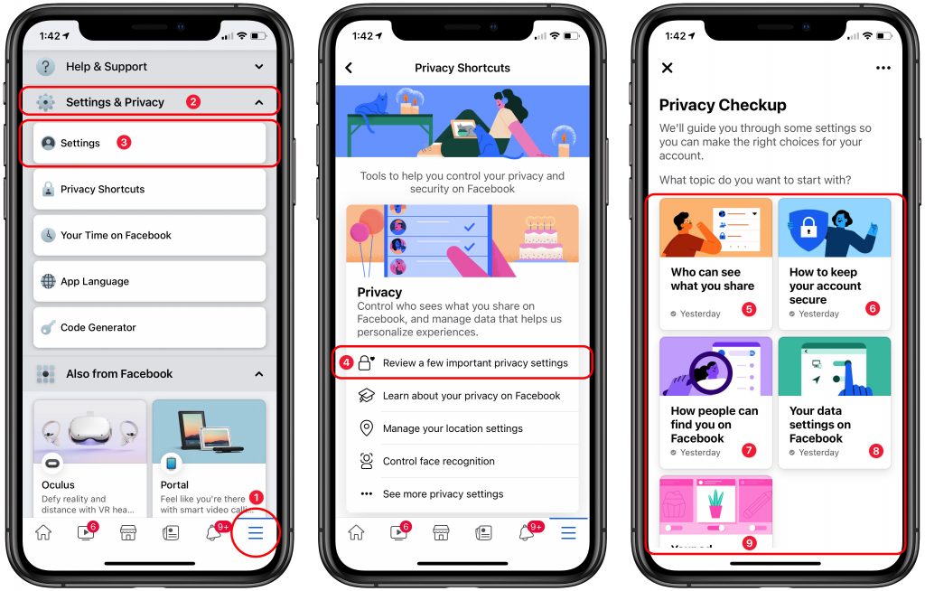 • In Facebook’s iOS app, tap the hamburger button in the bottom-right corner, scroll down to and expand Settings & Privacy, tap Privacy Shortcuts, and then tap “Review a few important privacy settings.”