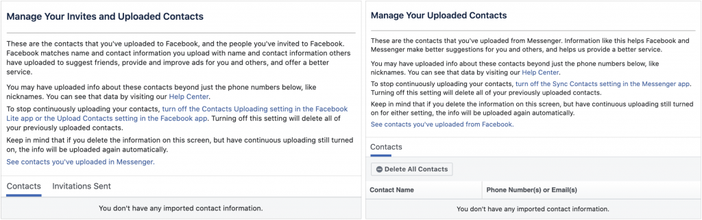 Beware that you could also be sharing information about everyone you know—Facebook loves to know who you know, even if they don’t have Facebook accounts. You can prevent this, but doing so requires two steps, one on Facebook’s Manage Your Invites and Uploaded Contacts page and another on Messenger’s Manage Your Uploaded Contacts page. Just delete them all. Otherwise, you’re giving away your contacts’ personal information without their permission.