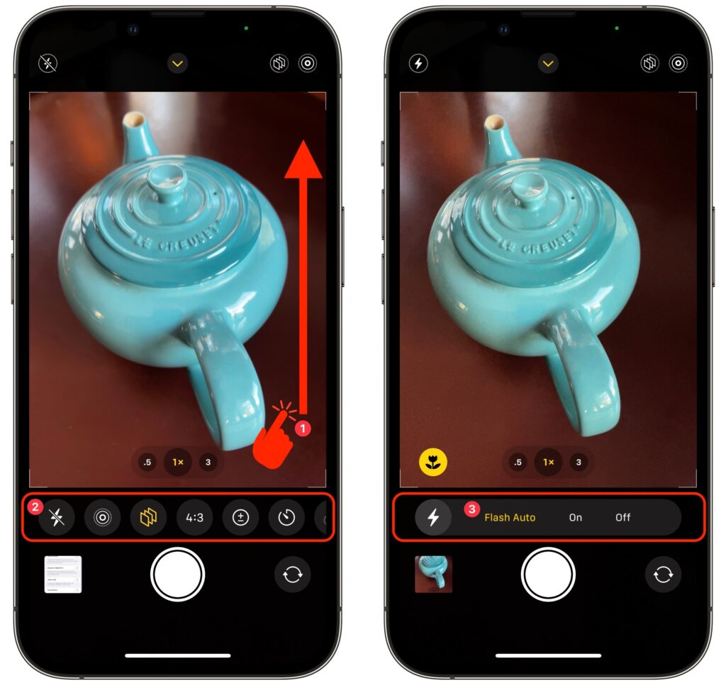 First, you have to reveal the controls, which is easy, although you’d never guess how. When you’re in the Camera app, swipe up anywhere on the screen above the shutter button. If you swipe up on the horizontal row of camera mode labels, your swipe can be quite short. However, if you swipe up on the viewfinder image, the Camera app might interpret a short swipe as a tap-and-swipe and display the in-image exposure control instead. On the viewfinder, use a longer, more emphatic swipe ➊. Either way, the camera controls replace the camera modes underneath the viewfinder ➋.