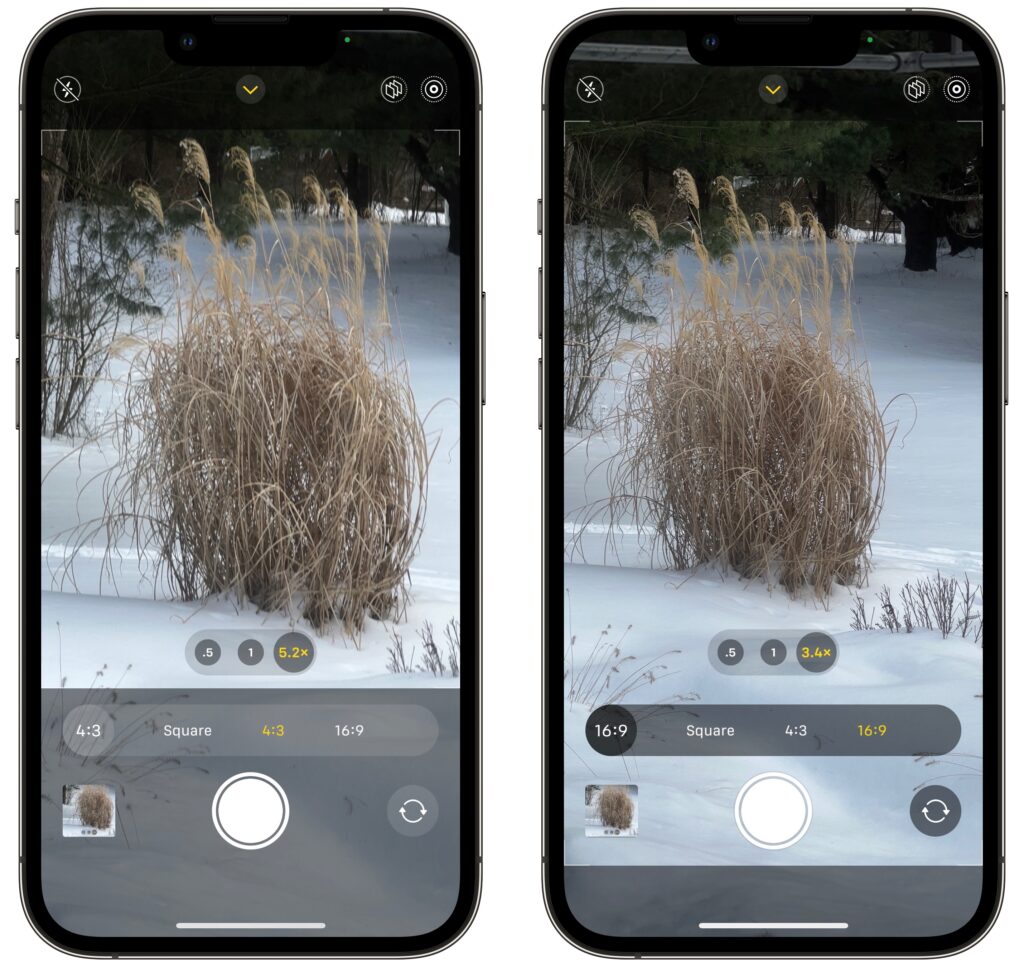 - Aspect Ratio: Some iPhones can take photos in multiple aspect ratios. Use this control to choose from the standard 4:3 (below left) ratio, square, and 16:9 (below right). The 16:9 ratio expands the viewfinder to show what it will capture.