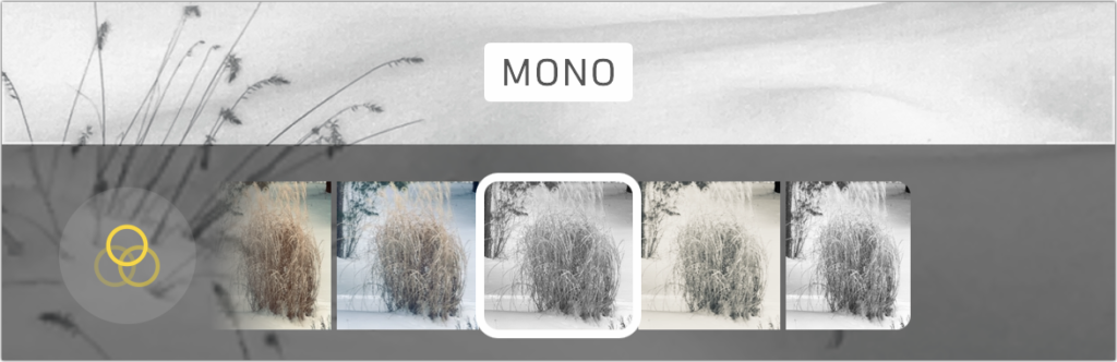 - Filter: The Filter button offers nine options, three each in Vivid, Dramatic, and Mono. You may want to turn one of these on to see its effect while composing the shot. Otherwise, it’s easier to apply them in editing later.