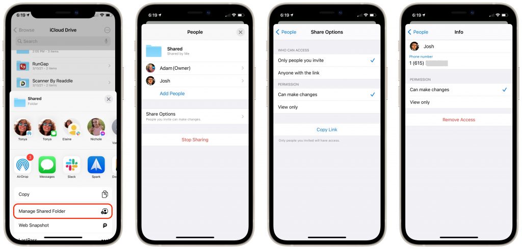 Managing a shared folder in the Files app is similar. Once you press and hold on an already shared folder and tap Manage Shared Folder in the Share sheet, you can do the following: