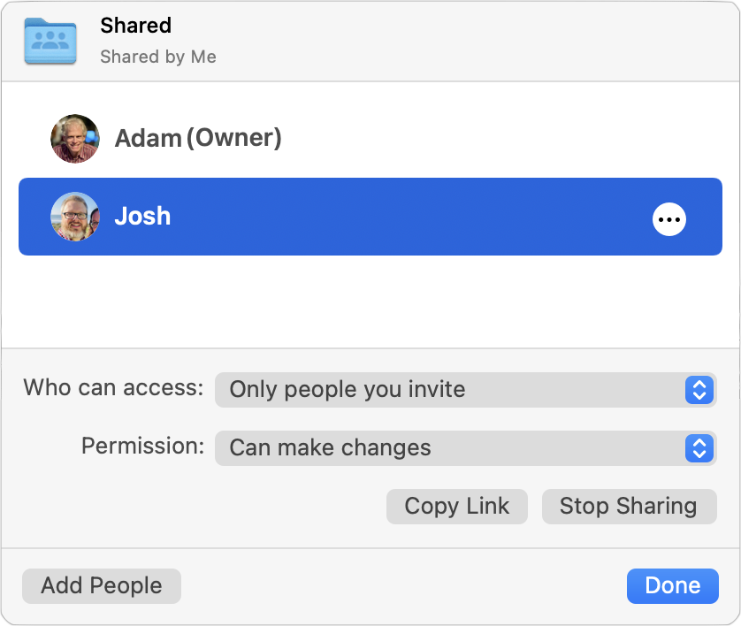 What if you need to invite more people, change permissions, get the sharing link again, or stop sharing entirely? Control- or right-click and choose Share > Manage Shared Folder (there’s also a Copy Link option there). A new dialog appears.