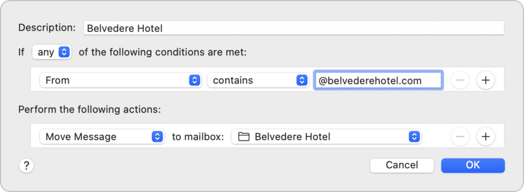 For instance, you could make a rule that moved messages from your contact at the Belvedere Hotel to your associated mailbox. That would work initially, but it would fail if you regularly work with multiple people there or if someone else fills in while your contact is on vacation. So instead of creating a rule that looks for a specific email address or even a set of email addresses, set your rule to look for all messages from the belvederehotel.com domain.