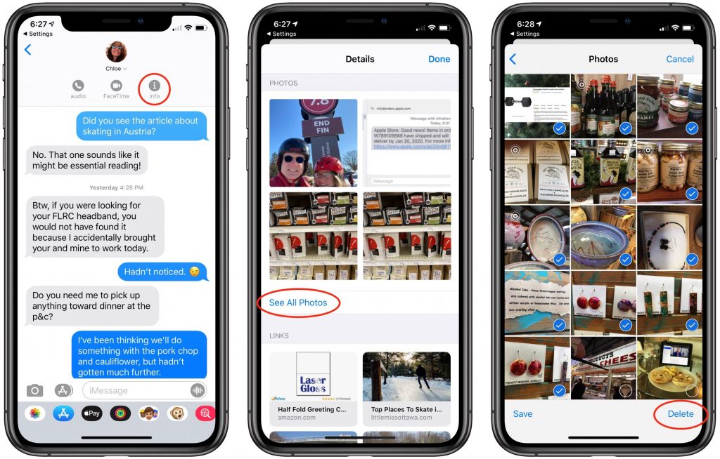 Finally, consider Messages. If you regularly trade photos and videos in chats, it could be another place you can save significant space. In the iCloud Storage screen, tap Messages > Top Conversations to see which conversations are the largest. Tap one to switch to Messages, tap the person’s avatar at the top of the conversation, tap the Info button, scroll down to see the photos, and tap See All Photos. Tap Select, tap photos you have no desire to keep within that Messages conversation, and then tap Delete at the bottom-right of the screen.