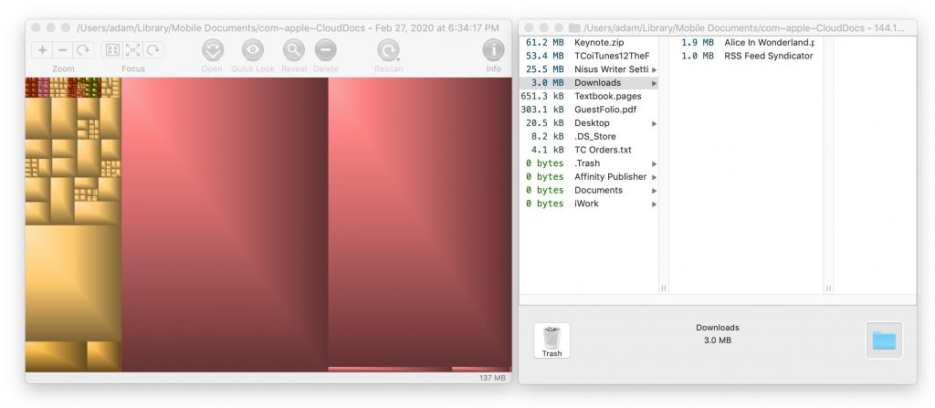 There’s no need to guess, however, thanks to free Mac apps that help you identify especially large files and folders. Our favorites are GrandPerspective and OmniDiskSweeper. GrandPerspective uses a graphical view so you can see at a glance where your space is going, whereas OmniDiskSweeper opts for a classic text-based approach that gives you hard numbers. In GrandPerspective, choose File > Scan Folder and select iCloud Drive in the sidebar of the Open dialog. For OmniDiskSweeper, choose File > Size Folder.