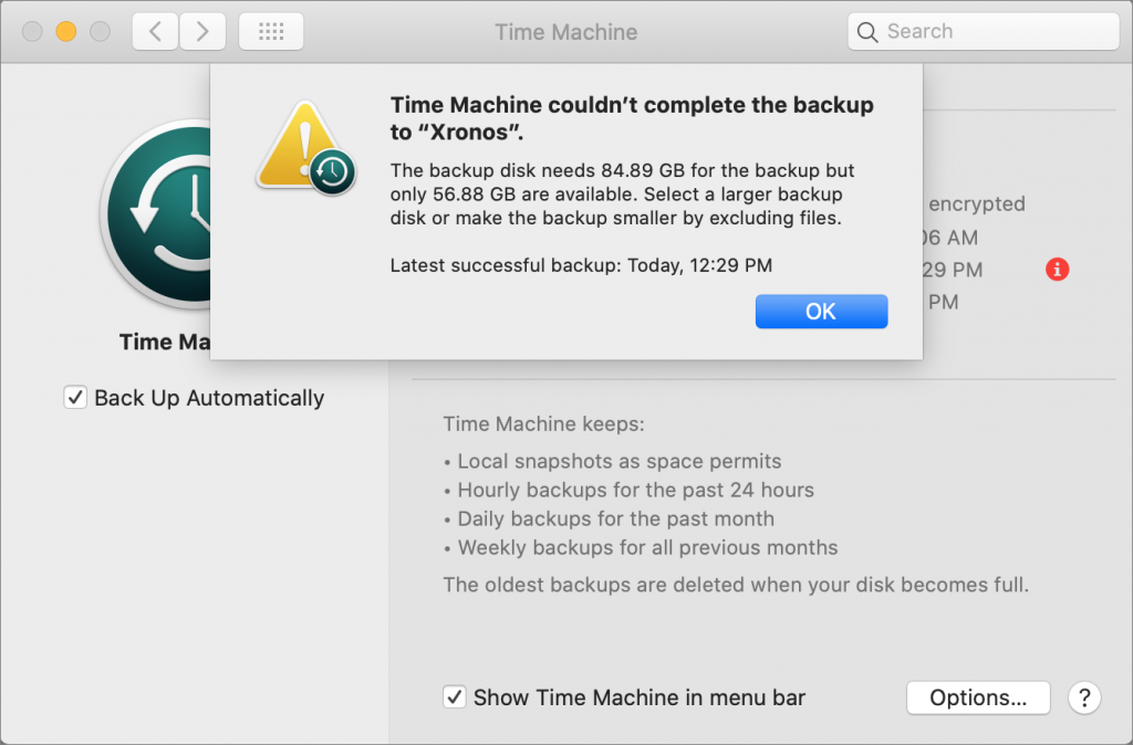 Eventually, however, even this technique runs into the wall of hard drives having only so much capacity. When that happens, backups will start failing, and this notification will appear after every backup attempt.