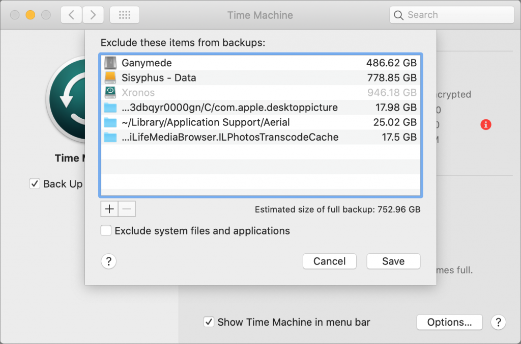 Another approach that Apple mentions is excluding items from the Time Machine backup. To do this, open System Preferences > Time Machine and click the Options button. Then drag the desired file or folder into the “Exclude these items from backups” list and click Save.