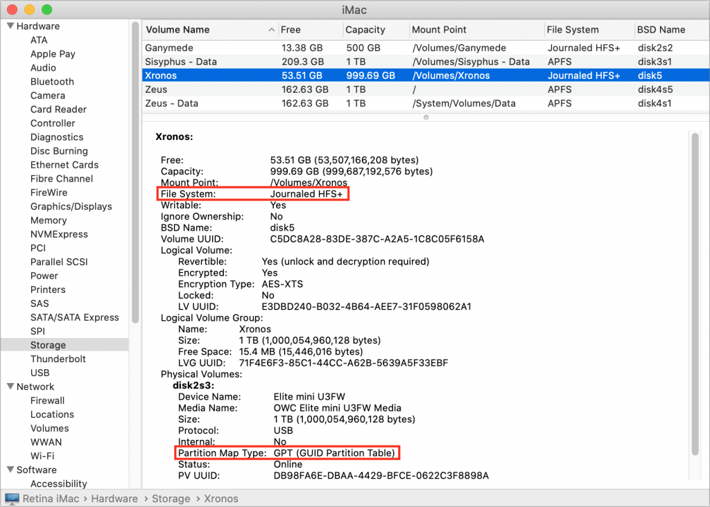 Or, rather, in an ideal world that would be true. You need to make sure that the new backup drive is formatted properly for Time Machine. Choose About This Mac from the Apple menu, and then click System Report to open the System Information app. In its sidebar, click Storage, select the drive at the top, and make sure File System is Journaled HFS+ and Partition Map Type is GPT (GUID Partition Table).