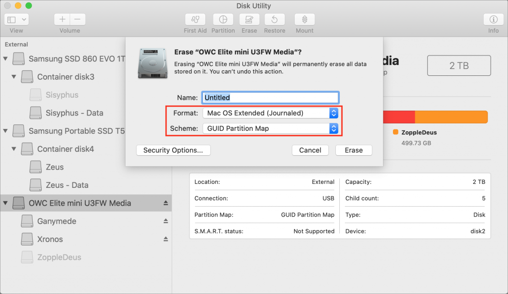 If the drive isn’t formatted correctly for Time Machine, open Disk Utility, select the drive in the sidebar, click Erase, and choose Mac OS Extended (Journaled) from the Format pop-up menu and GUID Partition Map from the Scheme pop-up menu. Then click Erase to ready it for Time Machine use. (This will, of course, delete all the data on the drive, so make sure that’s OK first!)