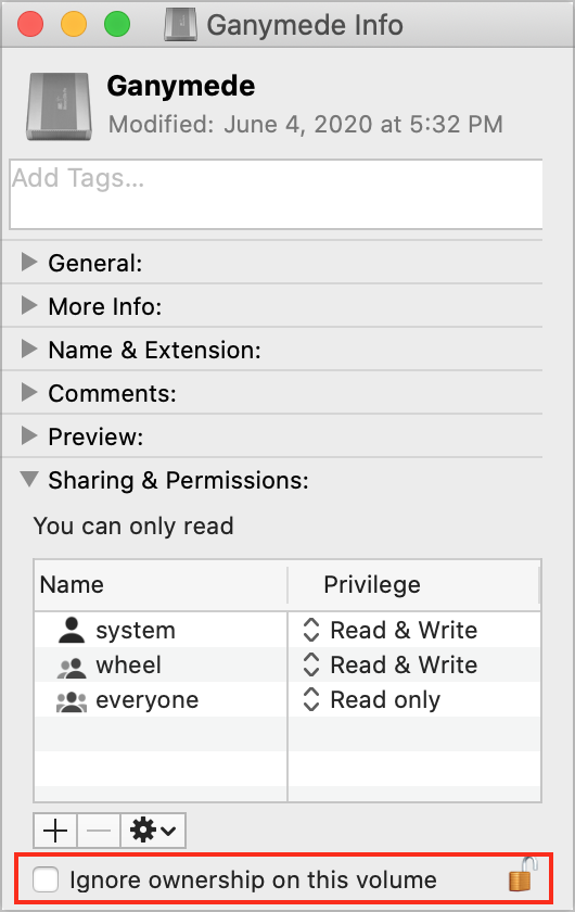 Finally, make sure the permissions on the new drive are set correctly. Select the drive icon in the Finder, choose File > Get Info, click the triangle next to Sharing & Permissions, and make sure the “Ignore ownership on this volume” checkbox is unselected. You may need to click the lock icon and enter an administrator username and password.