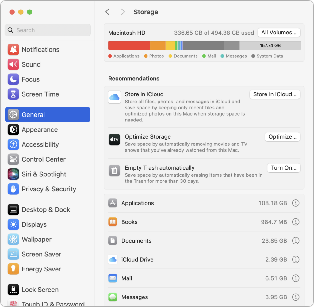 - Clear space: Sequoia may need as much as 25 GB of free space to upgrade, and the Sequoia installer itself is nearly 15 GB, so we recommend making sure you have at least 50 GB free. Don’t cut this close—you should always have at least 10–20% free space for virtual memory, cache files, and breathing room. Check in Sonoma or Ventura by choosing System Settings > General > Storage; in earlier versions of macOS, choose About This Mac from the Apple menu and click Storage. System Settings provides quick ways to free up space. Another easy option for iCloud Drive users is to Control-click large folders and choose Remove Download to “evict” the local versions of those files temporarily; Box, Dropbox, and Google Drive have similar features.