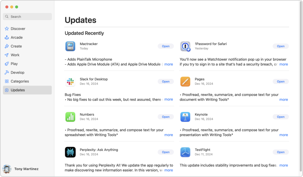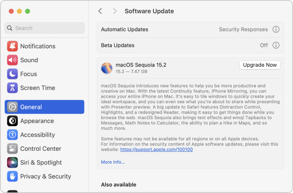 - Update apps: Make sure all your apps are as up-to-date as possible. If you regularly put off updates, now’s the time to let them complete so you have Sequoia-compatible versions.