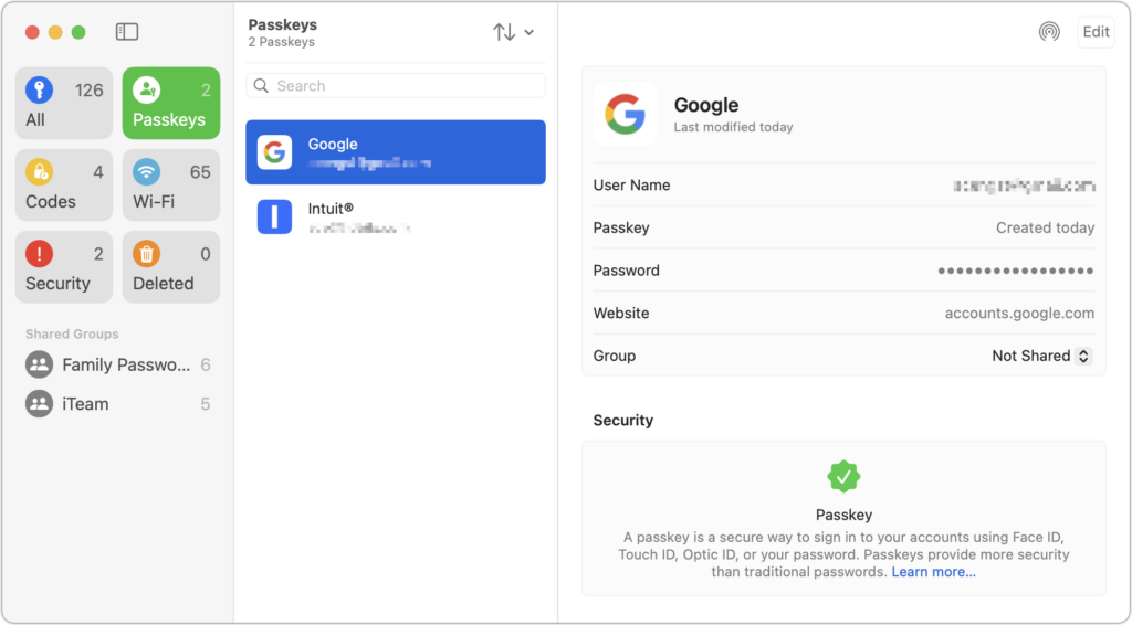 As noted, passkeys are stored in accounts managed by a password manager. In fact, passkeys are currently stored alongside passwords in each account. There’s nothing to see or edit, although you can delete passkeys like any other data. Although deleting the passkey on your device guarantees that it can’t be used to sign in again, it’s best to also delete the passkey at the website where you created it to avoid confusion.